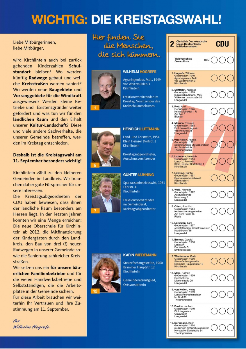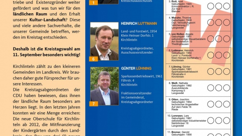Am 11. September entscheiden Sie, die Wählerinnen und Wähler, auch über den neuen Kreistag des Landkreises Verden. Mit 3 Stimmen nehmen Sie Einfluss auf die Frauen und Männer, die als Vertreter unserer Dörfer und unserer Gemeinde die Geschicke und die Zukunft unseres Heimat-Landkreises bestimmen werden. Aus der Gemeinde Kirchlinteln kandidieren auf der CDU-Kreistagsliste Wilhelm Hogrefe aus Luttum, Heinrich Luttmann aus Heins, Günter Lühning aus Otersen und Karin Wiedemann aus Kreepen-Brammer.